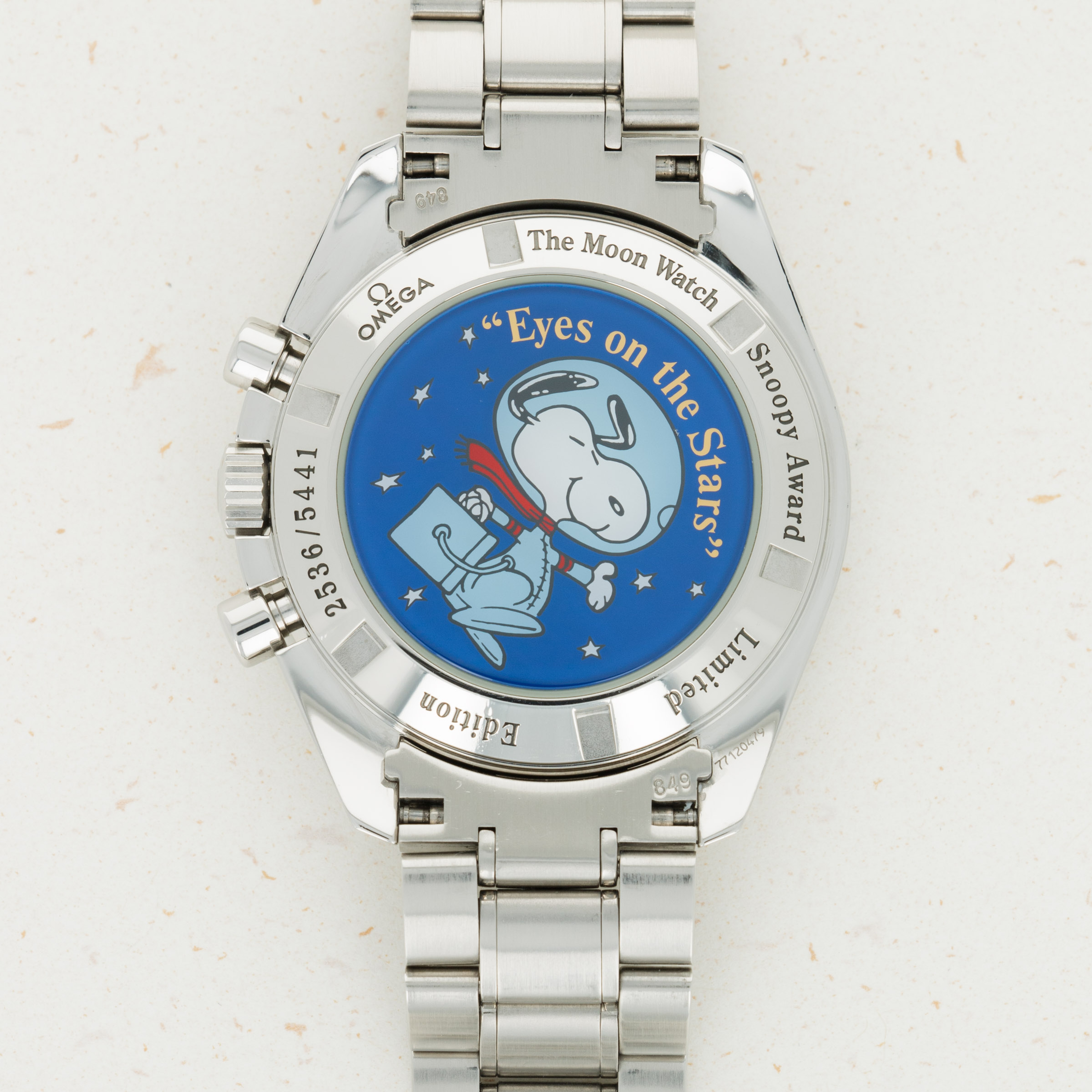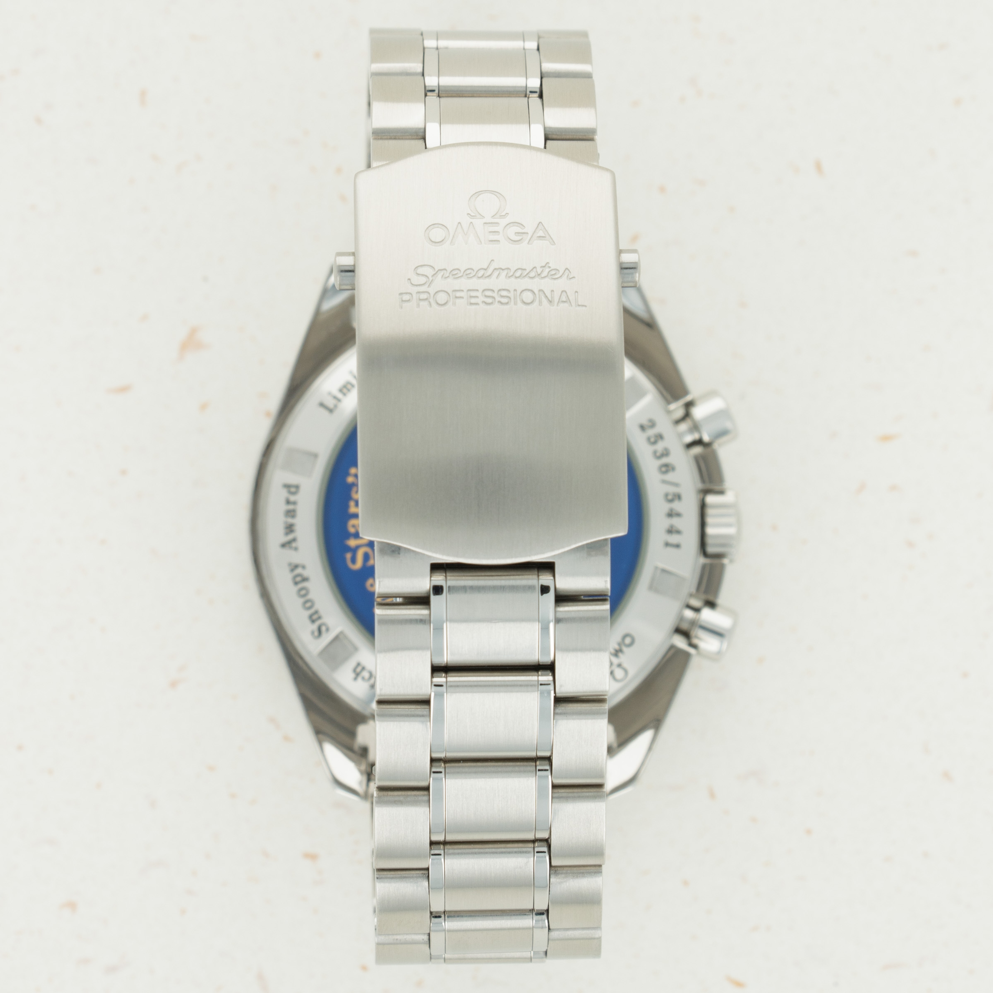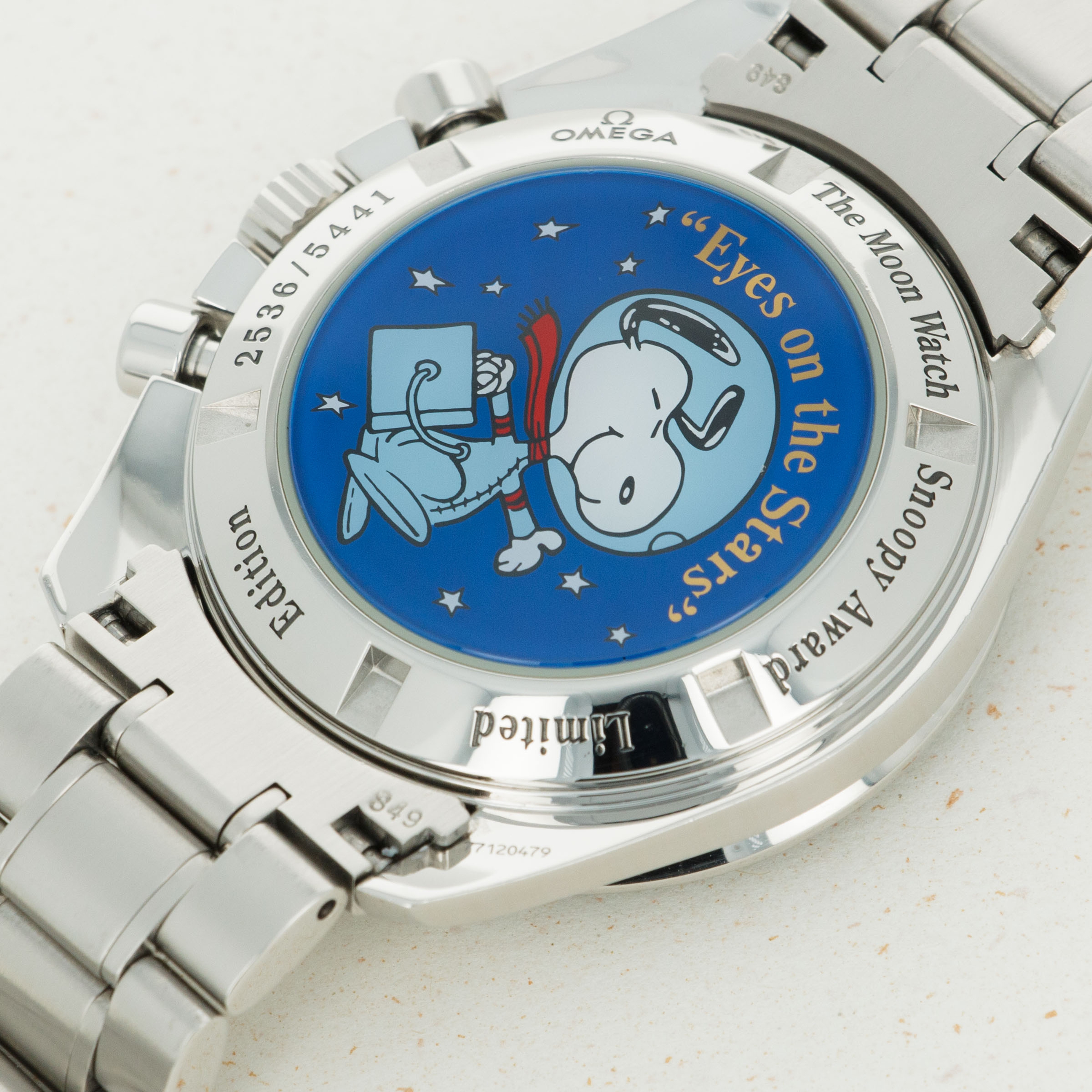 In place of the Omega Hippocampus normally found on the Speedmaster's caseback, the Blue Snoopy ref. 3578.51.00 features the engravings: Ω OMEGA – The Moon Watch – Snoopy Award – Limited – Edition – xxxx/5441 and the iconic "Eyes on the Stars" patch at its center.